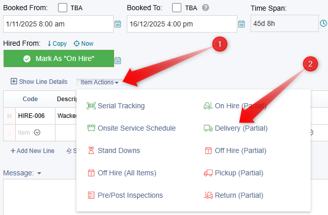 To schedule a partial pickup, it is necessary for the Invoice or the individual item to be marked as "On Hire". This requires the presence of a "Hired From" date.