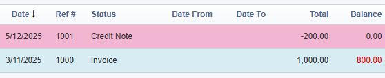 By offsetting the $200 Credit Note against the $1000 Invoice, the Credit Note balance becomes $0.00, while the Invoice balance is reduced to $800.