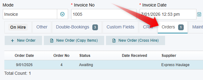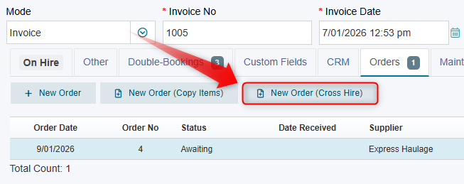 For optimal management of Cross Hire transactions, it is recommended that all Purchase Orders be created directly from the Invoice screen. This method automatically links the Purchase Order to the Invoice and displays it in the "Orders" tab for easy reference.