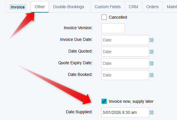 The "Invoice now, supply later" option is located in the "Other" tab of the Invoice screen. This checkbox is specifically designed for invoices and will only be visible when the system is in "Invoice" mode.